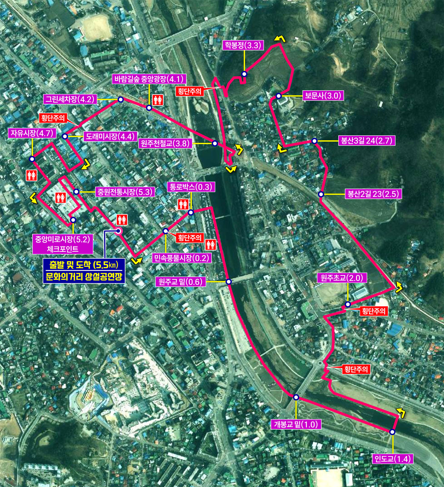 출발 ⇒ 민속풍물시장 ⇒ 원주초교 ⇒ 학봉정 ⇒ 원주천철교 ⇒ 바람길숲중앙광장 ⇒ 도래미시장 ⇒ 자유시장 ⇒ 중앙미로시장 ⇒ 중원전통시장 ⇒ 도착 - 참가인원/참가비 200명(선착순) / 10,000원 (1인)